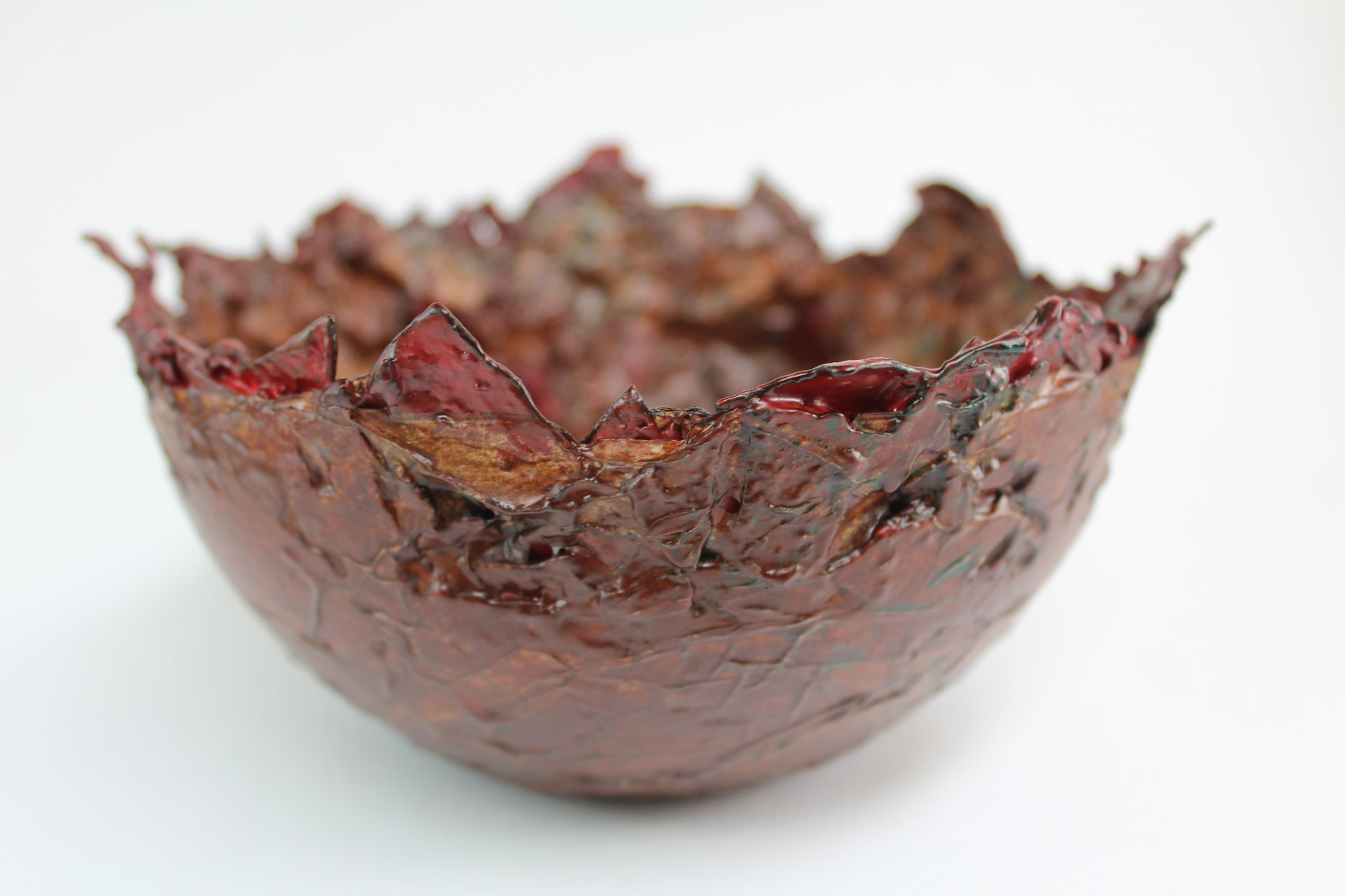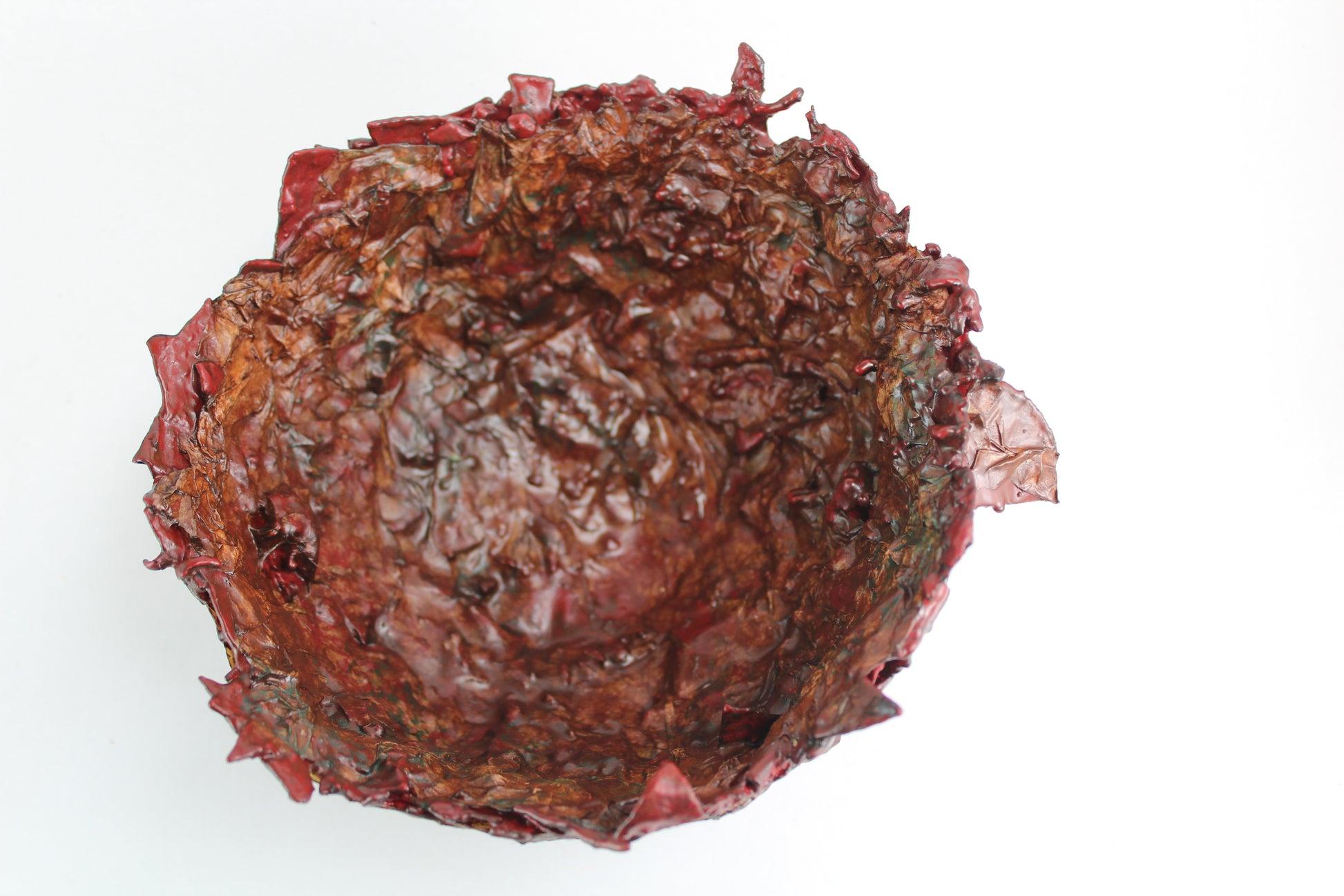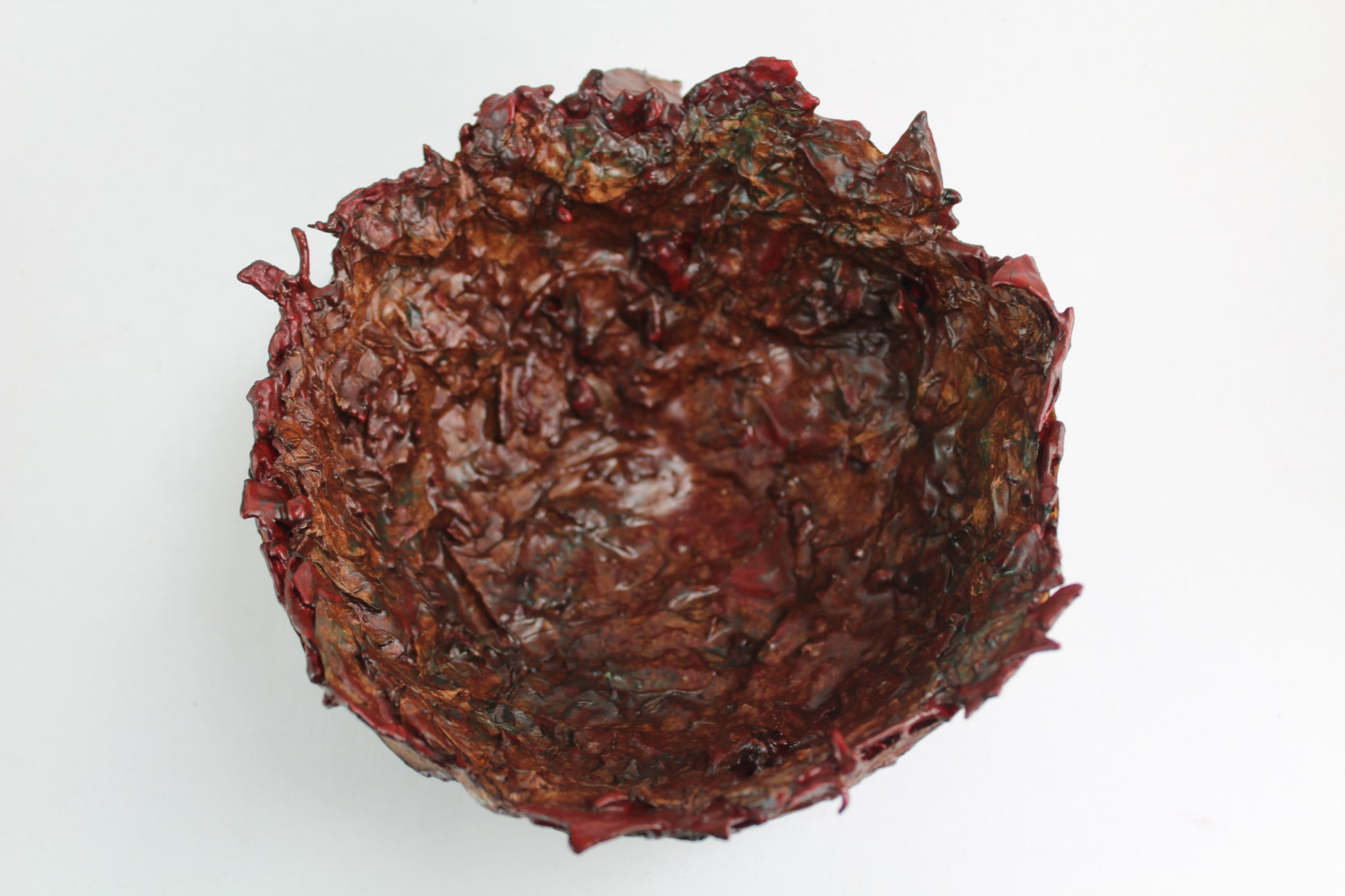 Bowl 5 Burgundy - so many little plastic pieces, old band aids, tissue paper and bits of sticky tape and old pegs etc. Painted many times with different colours, lacquered and polished. An objet d'art that is purely decorative. Not for eating out of, immersed in water or dropped. A gentle wipe and dust is all that is required.