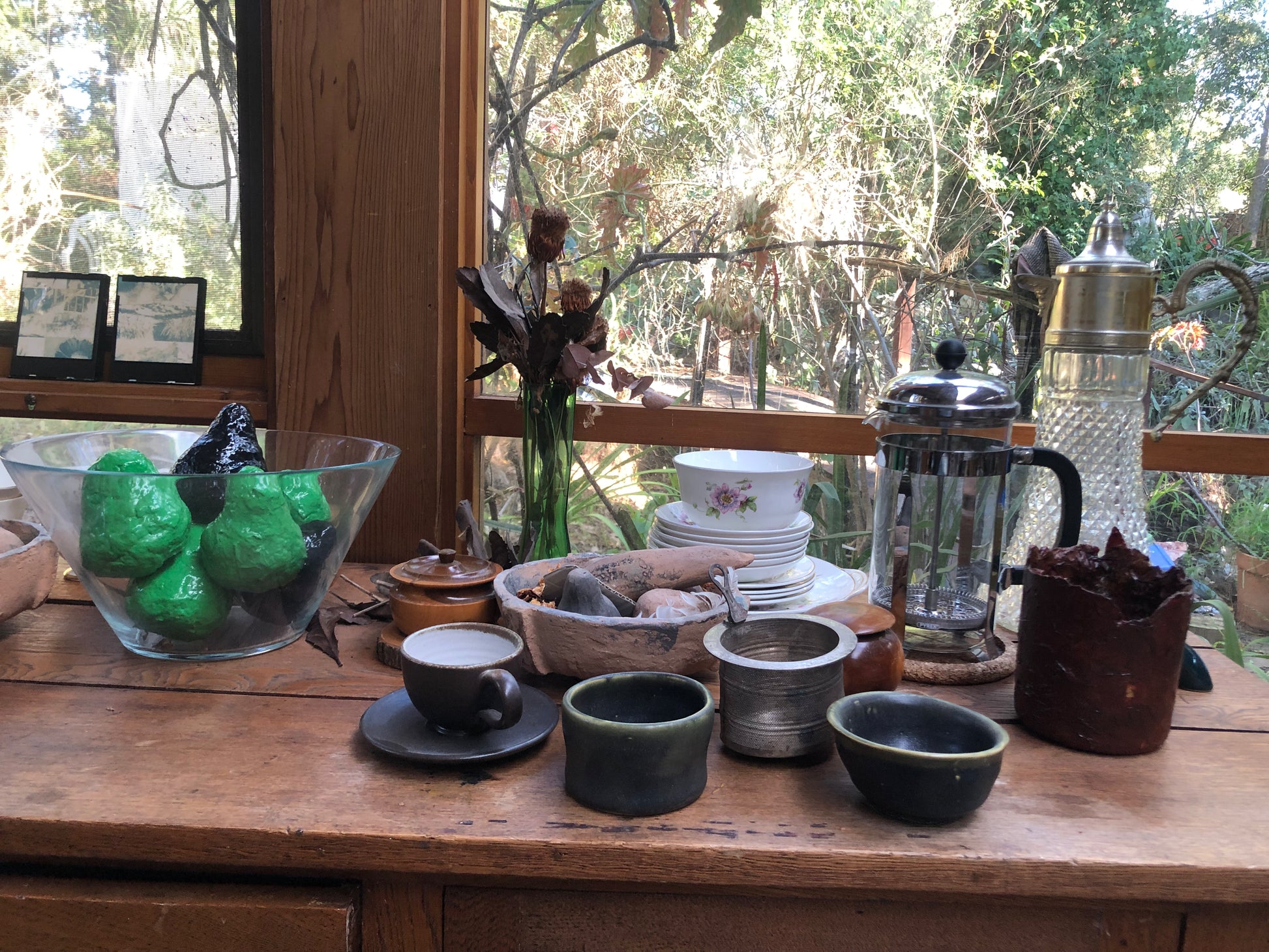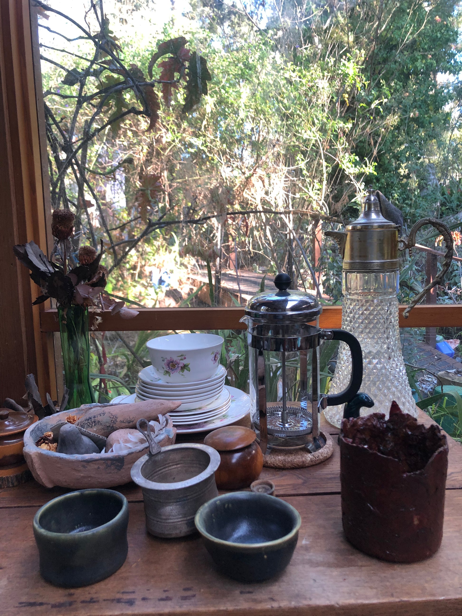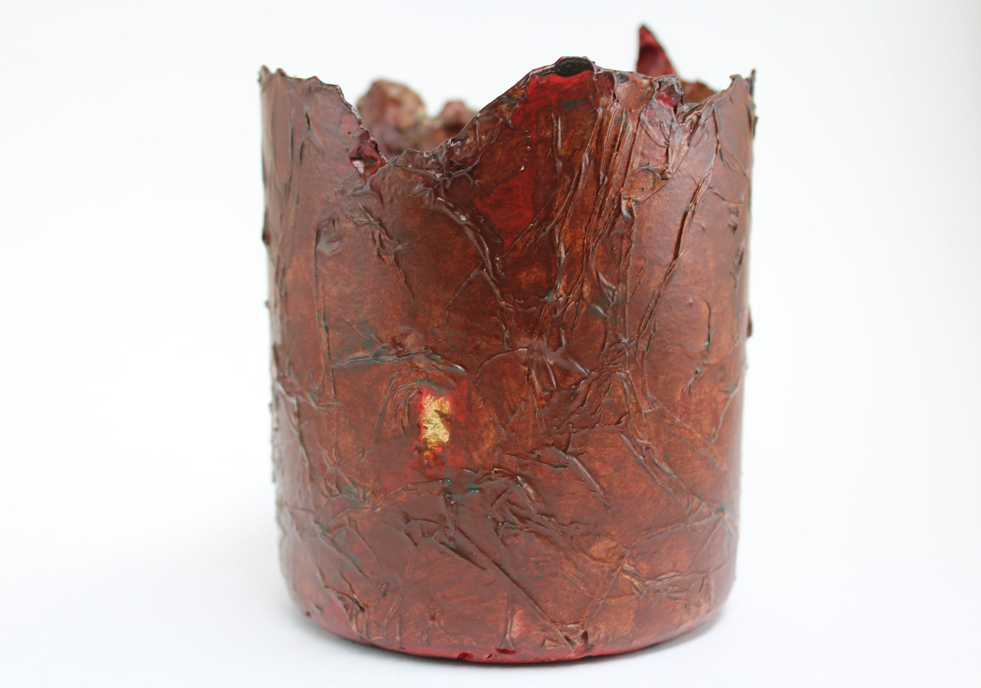 Vase 1 Burgundy - so many little plastic pieces, old band aids, tissue paper and bits of sticky tape and old pegs etc. Painted many times with different colours, lacquered and polished. An objet d'art that is purely decorative. Not for drinking out of, immersed in water or dropped. Great for dried flowers or just to look at. A gentle wipe and dust is all that is required.